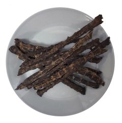 長さ10センチ前後、太さ1センチ弱の、スティックタイプのジャーキーです。鹿肉をミンチにしてからから細長く乾燥させてあるので、小さなワンちゃんでも食べやすいです。